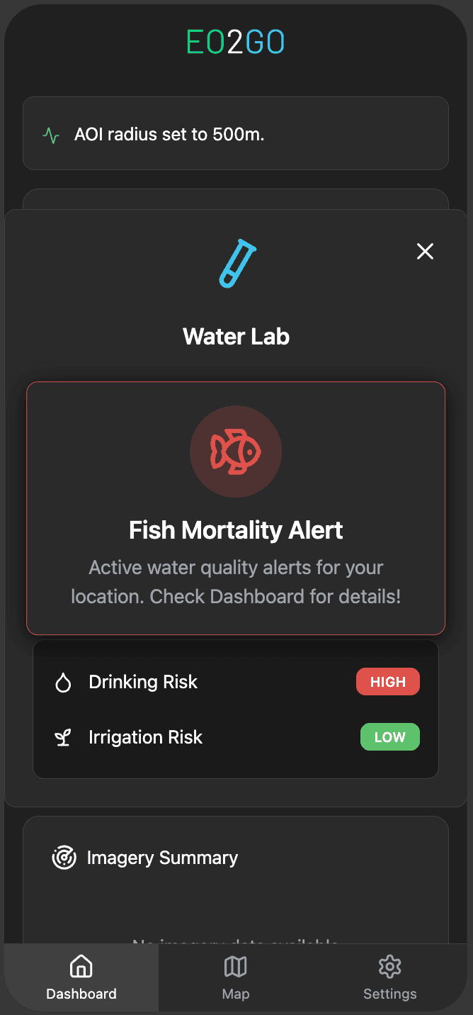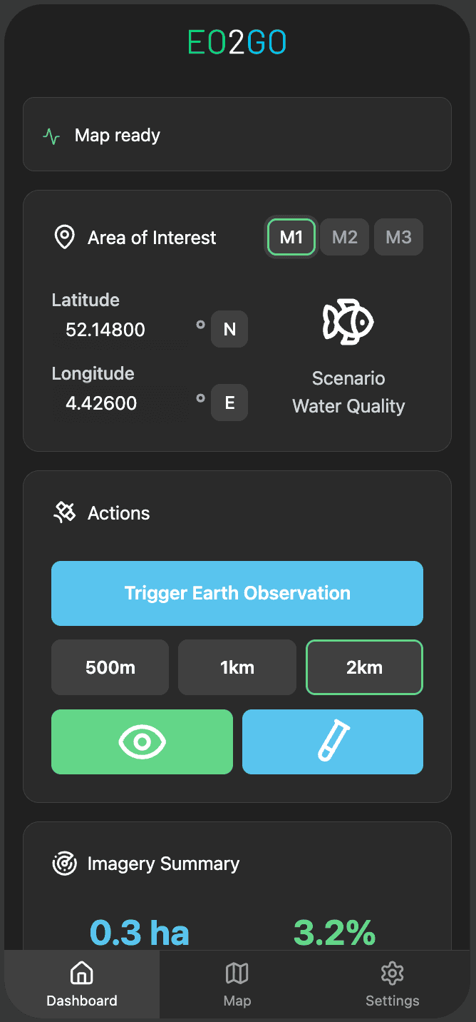 Whether you are a water NGO, a farmer, or simply want to track changes near your home, turn complex Earth Observation data into actionable insights. Powered by Edge AI, processing happens directly on your phone — delivering fast results even in remote areas.