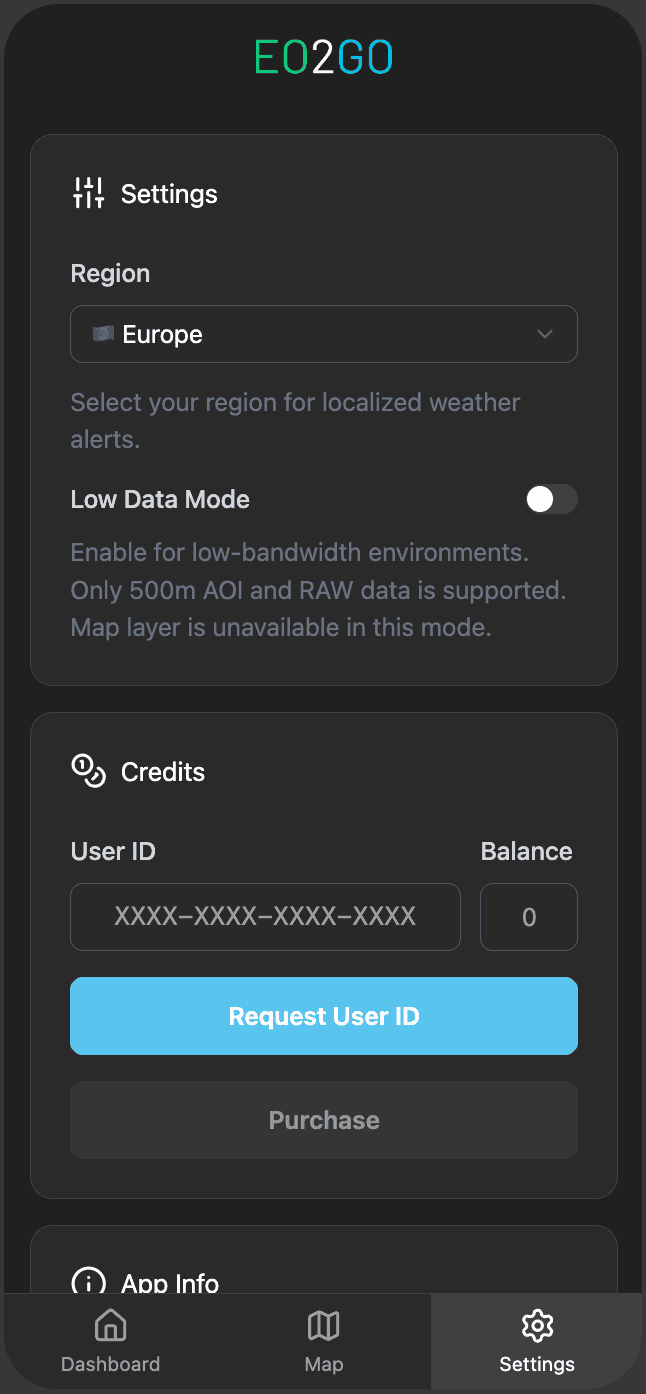 Receive national weather alerts, benefit from Low Data Mode for emerging D2C / D2D connectivity, and manage your usage credits — all in one place.